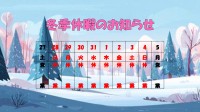 日頃よりお世話になっております。冬季休業日のお知らせです。12月28日(日)~1月4日(日)まで休業となっております。休業中の連絡は代表番号へ転送されます。お急ぎのご用件は会社へおかけくださいますよう...